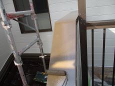 ベランダ手摺板金の下塗り(サビ止め)塗布作業の様子です。