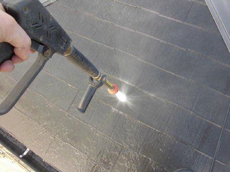 • 屋根 バイオ洗浄剤塗布の様子です。通常の水洗浄では落とせない汚れを落とし塗装に最適な下地を作ります。
