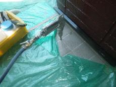 高圧洗浄に先立って、クリーナスーパーバイオ洗浄剤塗布の様子です。水のみの洗浄に比べて格段に汚れの落ち方が違います。