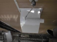軒天の上塗りの様子です。塗布量や塗りムラ、飛散に注意し慎重に作業していきます。