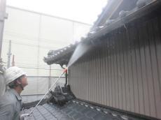 塀の高圧洗浄の様子です。建物だけでなく塗装後のトータル的な美装を大切にしています。