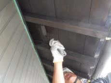 軒天の下塗りの様子です。木部は専用の塗料で丁寧に塗装していきます。