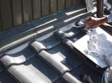谷樋板金カバー作業の様子です。(付近の瓦を撤去します。)